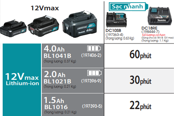 • Sạc nhanh: giống như DC18RC để sạc pin LXT 14,4V/ 18V; giống như DC10SB để sạc pin CXT 12Vmax.