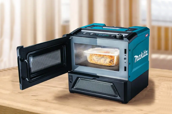 Makita MW001GZ là lò vi sóng không dây, được cấp nguồn bằng pin Li-Ion 40Vmax XGT (hai song song hoặc một) hoặc bộ nguồn di động PDC1200.