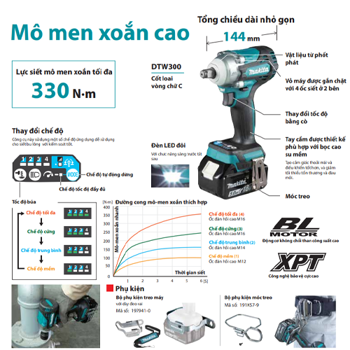 Tóm lại, máy siết bu lông dùng pin 18v Makita DTW300XVZ là một sản phẩm công nghệ tiên tiến, đáp ứng được nhu cầu của các ngành công nghiệp và sửa chữa hiện nay. Với sức mạnh, tính di động và tính năng đa dạng, máy sẽ là trợ thủ đắc lực cho người dùng trong quá trình làm việc.